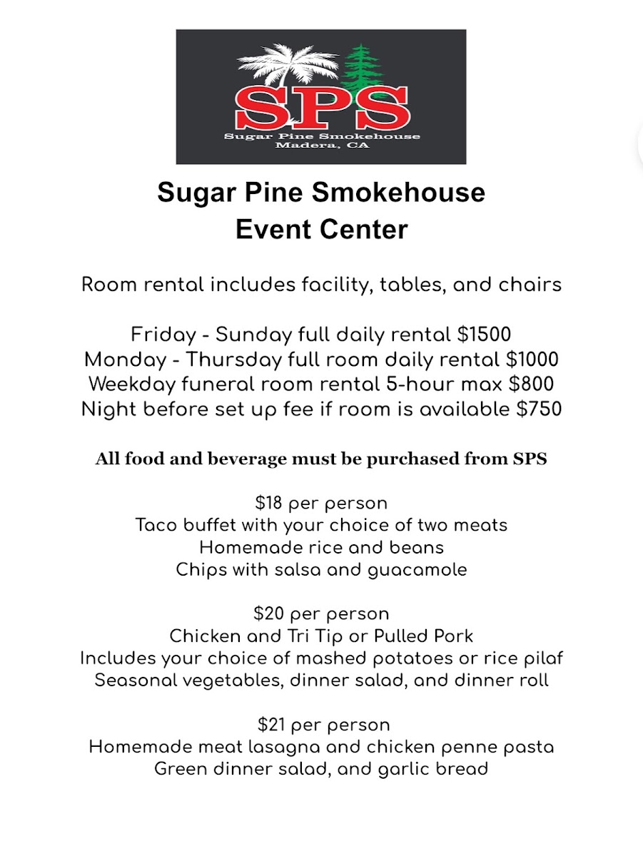 Welcome to Sugar Pine Smokehouse, located in the heart of Madera, CA, where flavor meets hospitality. This BBQ haven boasts a diverse menu highlighting various smoked meats and mouthwatering sides, designed to satisfy all appetites. Customers rave about the Texas Platter, a massive feast served on a cafeteria-sized tray, perfect for those seeking hearty portions. The TriTip, though a California twist, has won hearts for its tender quality.